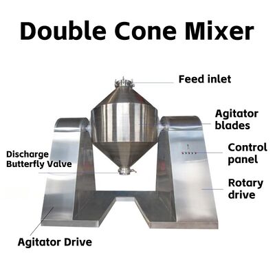 Μίξερ διπλού κώνου επαγγελματικού επιπέδου με δομή κωνικής ανάμειξης χαμηλών υπολειμμάτων για ομοιόμορφη ανάμειξη σε σκόνη ή κοκκώδη υλικά στις χημικές, φαρμακευτικές, βιομηχανίες τροφίμων, δομικών υλικών και φυτοφαρμάκων.